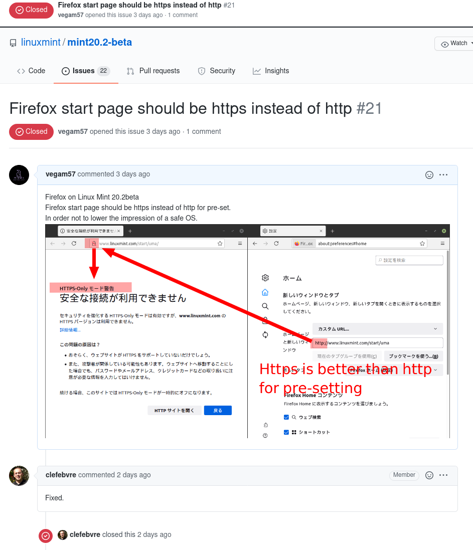 ①プレインストールされるFirefoxのスタートページ(Linux MintのURL)が、もちろんHttpsページは実在するのに、20.2ではHttpになっている。