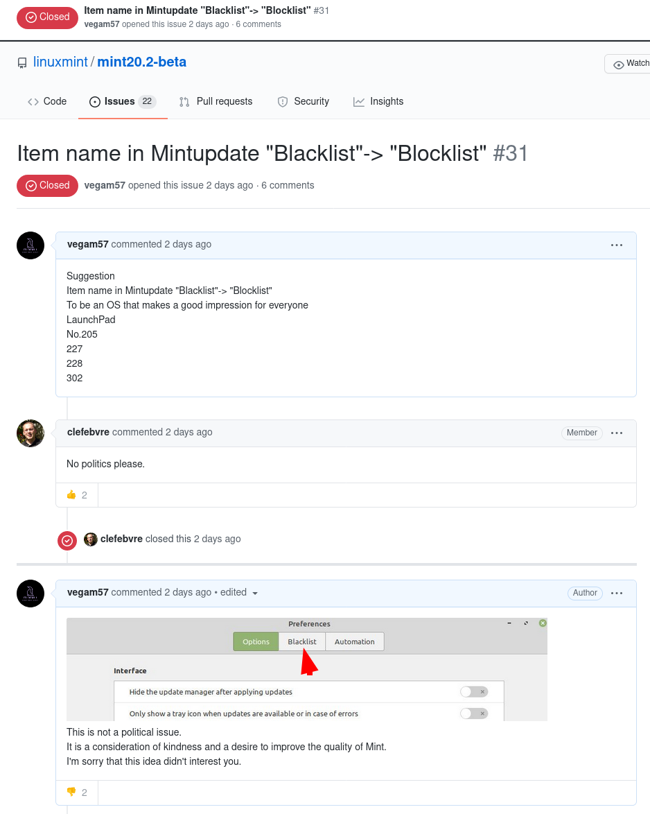 ③機能改善、アップデートマネージャーの項目名の「Blacklist」は「Blocklist」に変更しておいた方が良いのでは?との提案 (Linuxカーネルでの「master/slave」と「blacklist」禁止、トーバルズ氏が承認)
