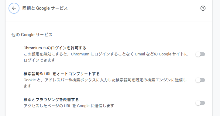 Chromium でGoogleアカウントとの同期は不可になったはずだから、これからはわざわざこのスイッチをオフにしないとGoogleのサイト自体へのログインが出来ない?
