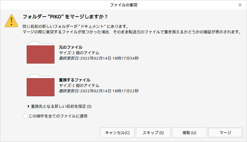 もし先方に同じフォルダー名が既に存在していた場合は...