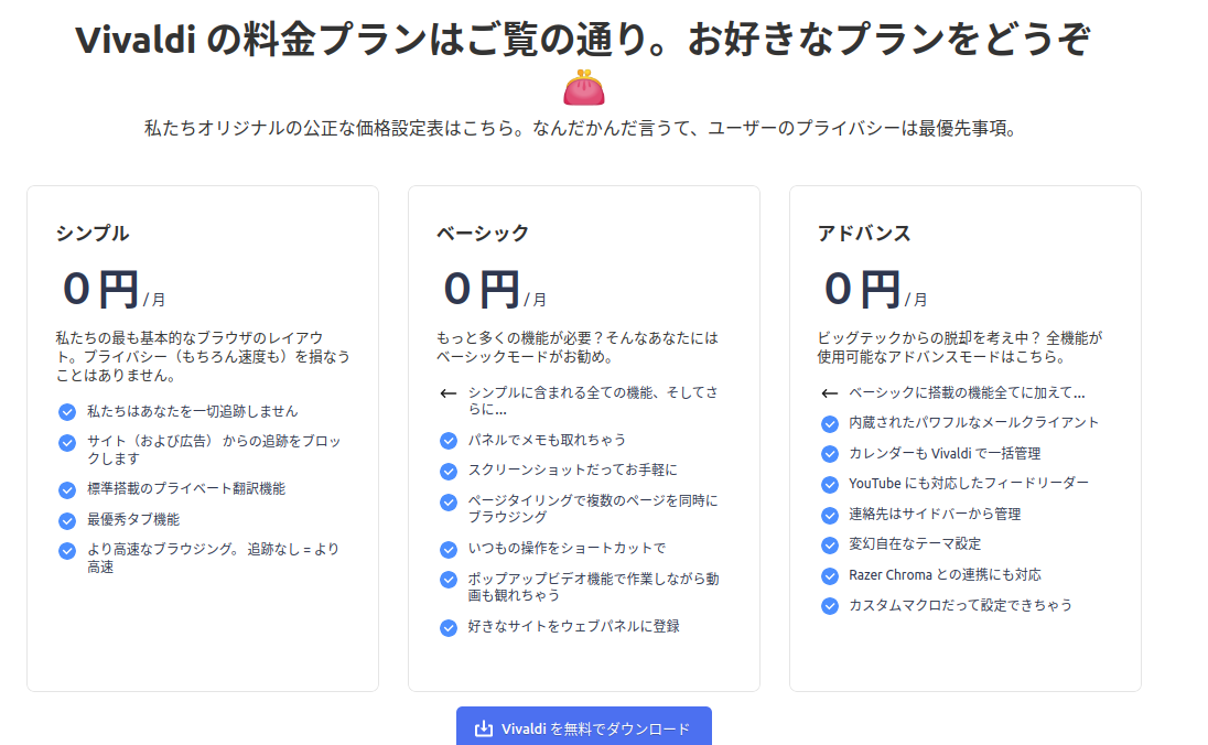 多機能なVivaldiをシンプルに使ってもいい。料金表示のユーモアのセンスがいいね。