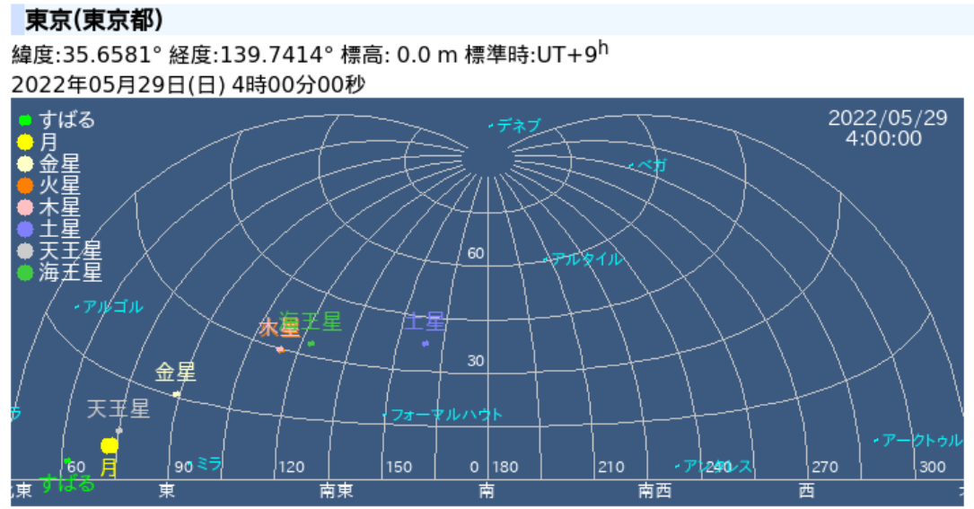 2022年05月29日 明けの明星、Morning Venus、午前4時 朝4時に起きると、東の空に神秘な輝きを発見。金星と木星とのこと。気温、空気の透明感も気持ちがいい。画像出典 https://eco.mtk.nao.ac.jp/cgi-bin/koyomi/skymap.cgi上の画像は国立天文台のサイトLinux ソフトウェアでは下記がメジャーものらしい。Stellarium カテゴリなしの他の記事 < 前の記事次の記事 > コメント コメントフォーム 名前 コメント 記事の評価 リセット リセット 顔 星 情報を記憶 コメントを投稿する