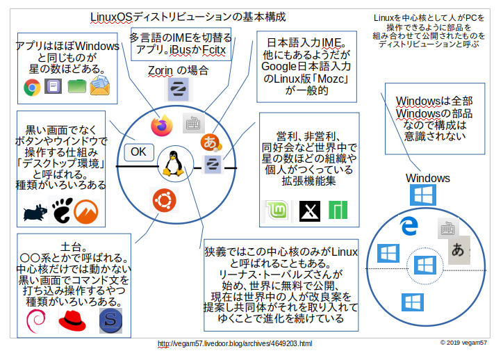 2019年12月11日 Linux初心者によるLinuxOSの基本構成図 Linux初心者である私、こういういイメージがくっきりするまで数ヶ月かかった。Windowsしか知らないとこの図でいうと、Zorinとubuntuの関係、「デスクトップ環境」の役割、iBusとMozcの関係がイメージしにくかった。細かい正確性は省略。ポケモンのボールのようになってしまったが、まさにモンスターが詰まっている。ペラ1図解集もう一歩踏み込んで構成を俯瞰するにはelementary OS のホームページのこのページが理解しやすい。 高齢者 Linux. カテゴリなしの他の記事 < 前の記事次の記事 > コメント コメントフォーム 名前 コメント 記事の評価 リセット リセット 顔 星 情報を記憶 コメントを投稿する