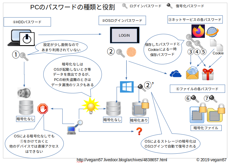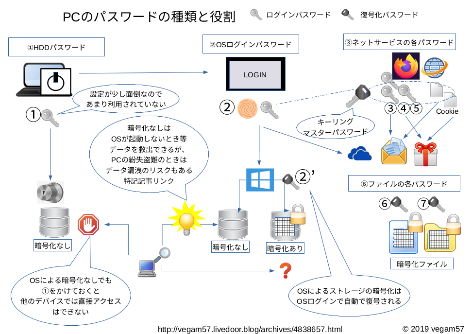 ②’ はOSによってハードディスクを暗号化するもの。WindowsだとBitlocker、Linuxは日本語だと単に「暗号化」と呼ばれる。スマホのストレージの暗号化もこの類。②でログインすると秘密の②’ 復号キーで自動で復号してくれる。若干遅くなる。実際、スマホのこれは動作が少し遅くなった気がする。