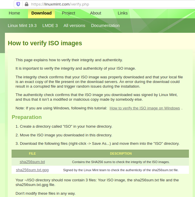 このかんたんな図解はLinux Mintの例だが、Linux Mintは公式サイトのダウンロードページにDon't forget to verify your ISO部分のリンク先で方法が載っている。