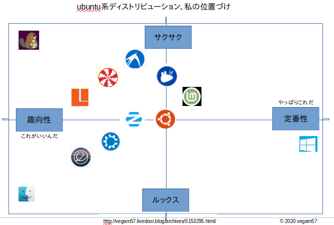 下図は、ubuntu系ディストリビューション、私の位置づけ。もしWindows7からLinuxのOSに乗り換える人あらば、ディストリビューション選びの参考材料の微塵にでもなればと思う。メモリー2GBで使うなら中心ラインを超えた上のディストリビューション、中心ライン以下はLinuxと言えどもメモリーは3GBはほしい。2GBだとすぐにスワップが発生してひっかかるような動作が目立つ。
