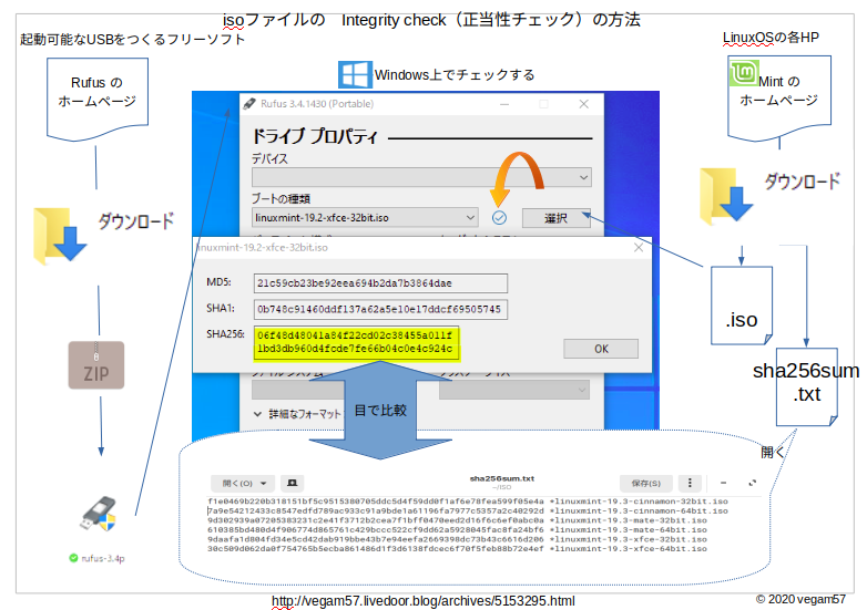 下図は、ダウンロードしたisoファイルが開発者が発表した正当なものかをチェックするためのペラ1図解 (Windowsで)