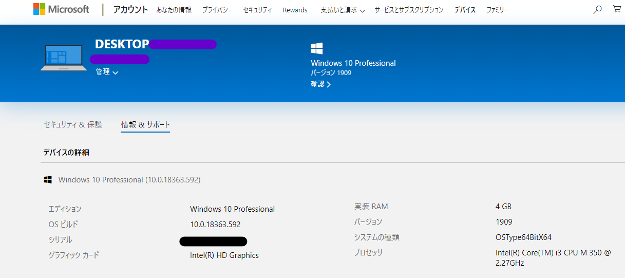 確かにこれだ。Microsoftアカウント上でも交換後マザボのシリアル番号で再認識された(黒塗り部)