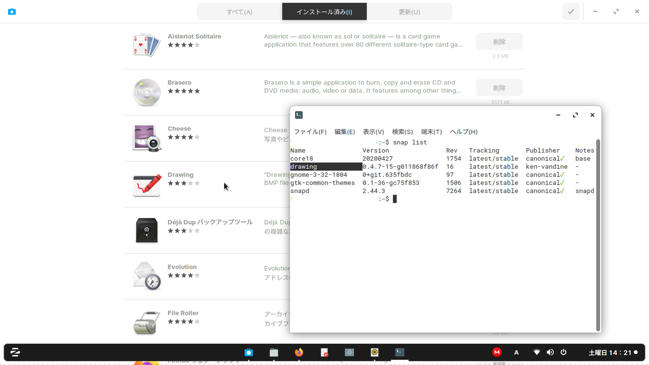 このsnap版Drawing をインストールしても、apt の管理下じゃないので、Synaptic パッケージマネージャには現れない。