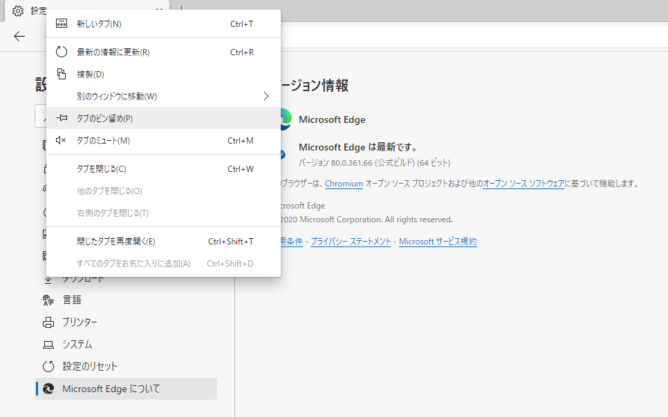 Chromium系ブラウザなら、ブラウザの設定画面で「○○について」を開くと、アップデートがチェックされる。これを右クリック内メニューでピン留めしてしまう。