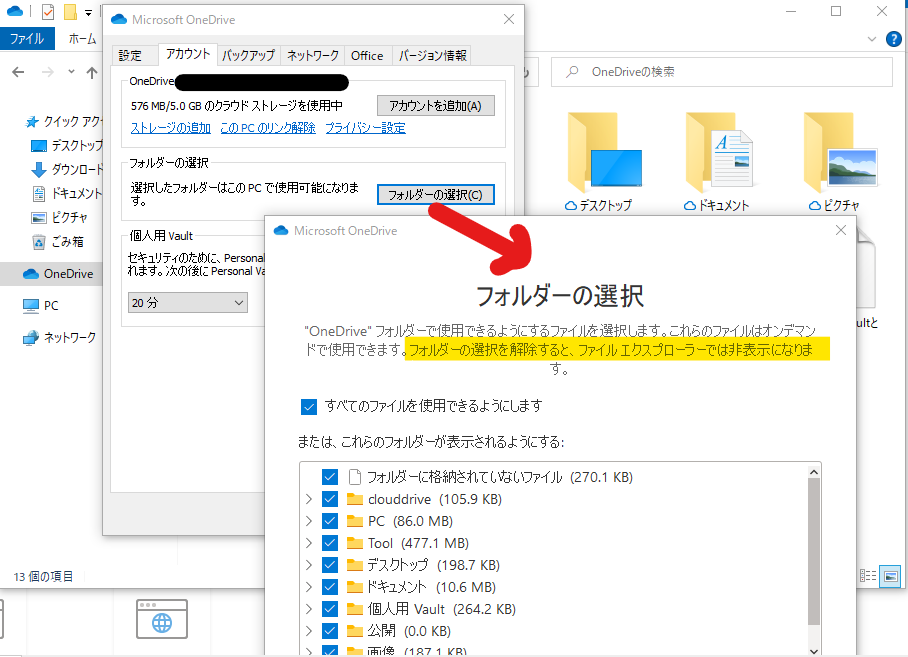 Windows OneDriveの場合、エクスプローラー内で非表示にするフォルダはOneDrive設定でレを外す。