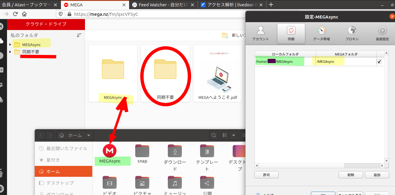 デバイスのローカル同期アプリをインストールすると、Linuxだとホームフォルダー内にMEGAsyncというフォルダーがつくられる。クラウドとの同期専用フォルダだ。