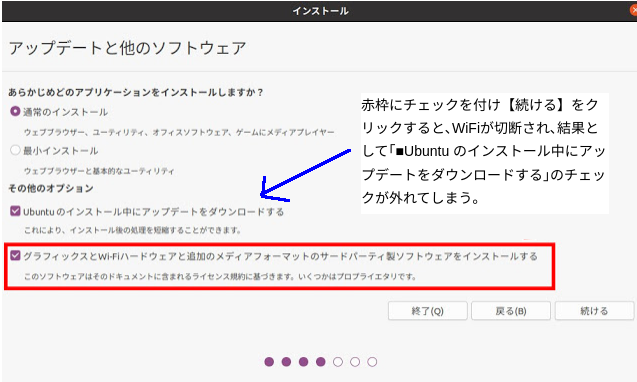 その時は忘れずに再度赤枠とその上の「■ Ubuntu のインストール中にアップデートをダウンロードする」もチェックし直さないと、仕上がりに影響する。