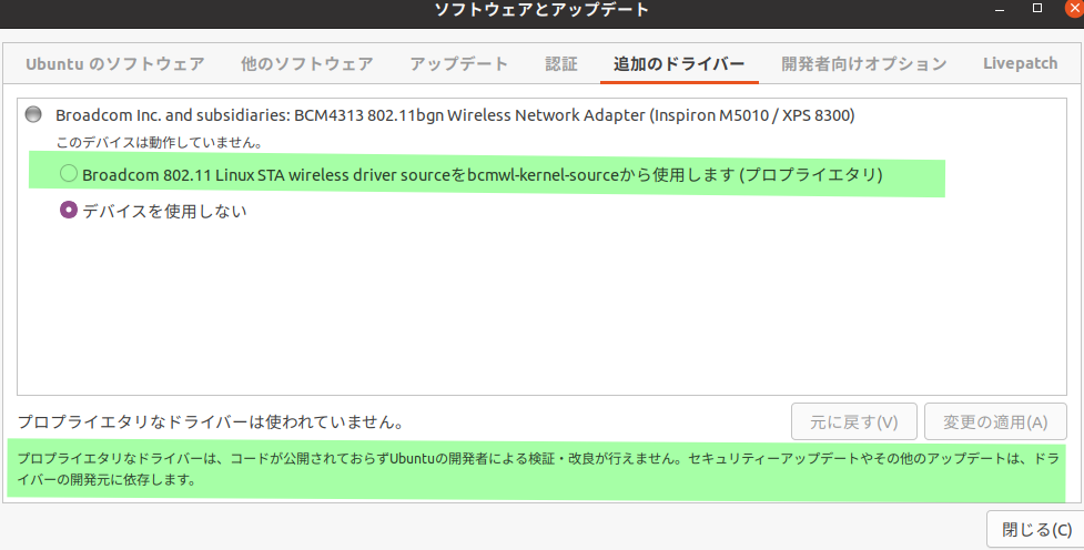 インストールが終わってから追加のドライバータブを開くと、問題のサードパーティ製WiFiドライバーがあるよ、といつも出る。インストール時には結局、汎用的なドライバーを当てたということだろうか?