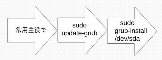 蛇足事項設定は、ファイルでいうと、各ディストリビューションそれぞれ、 /boot/grub/grub.cfg に書かれているが、そのgrub.cfg 中身の細かい編集は、別のテキストファイル /etc/default/grub の方を編集してからsudo update-grubコマンドを実行することによって反映させる決まりになっている。回りくどいプロセスでややこしい。一、別のテキストファイル /etc/default/grub の方の編集が、ブランチでのコミットで二、sudo update-grubコマンドがマージのような感じ。
