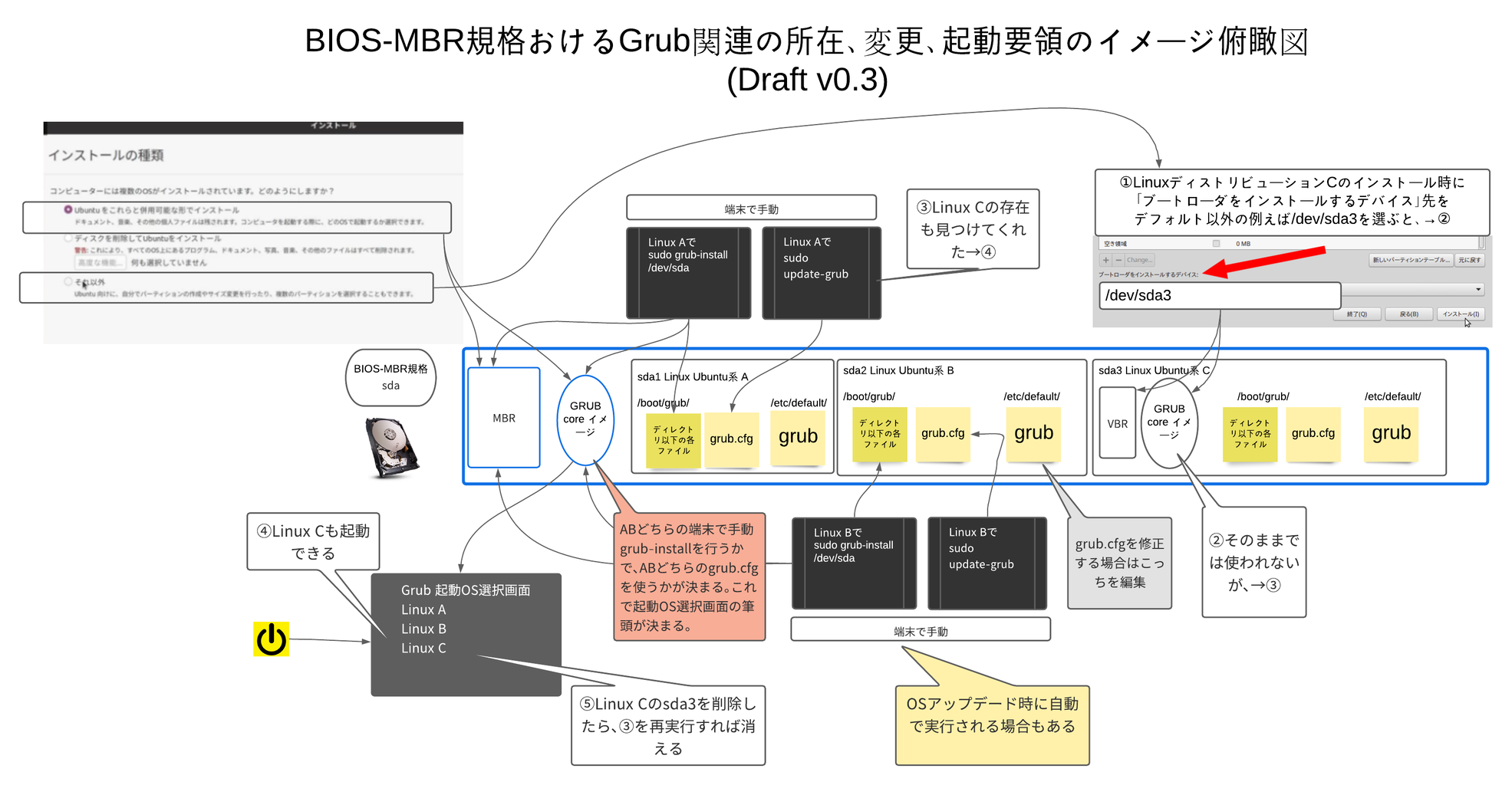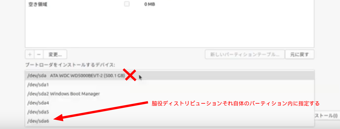 以後、お試しLinuxディストリビューションをインストールする際には意図的に「ブートローダをインストールするデバイス」先をお試しディストリビューションそれ自体のパーティション内を指定する。(まとめ的俯瞰図の①)