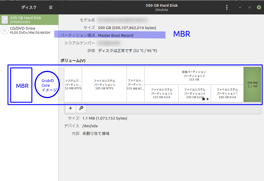 お試しLinuxディストリビューションのGrub設定(grub.cfg)を幽閉しても、主役LinuxディストリビューションのGrub設定はHDDの先頭に存続している。