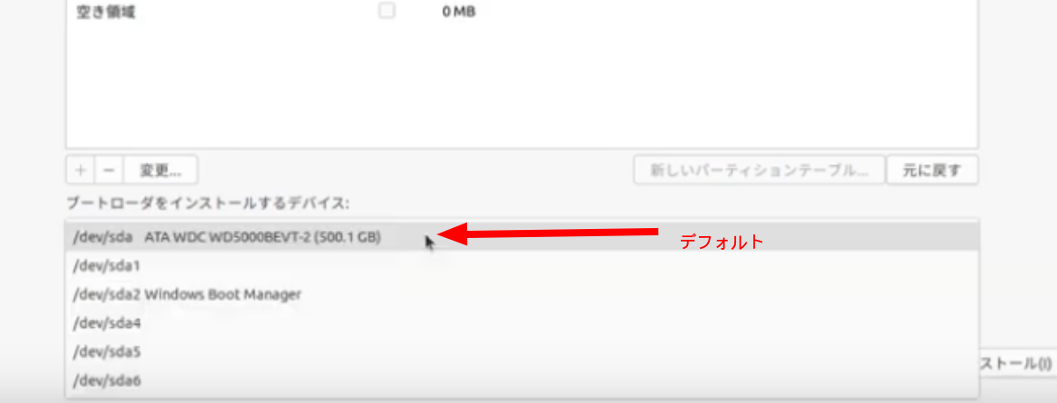 - 各ディストリビューションのインストール時は、「ブートローダをインストールするデバイス」先を気にしてなかった、又はデフォルトのまま触らなかった.../dev/sda